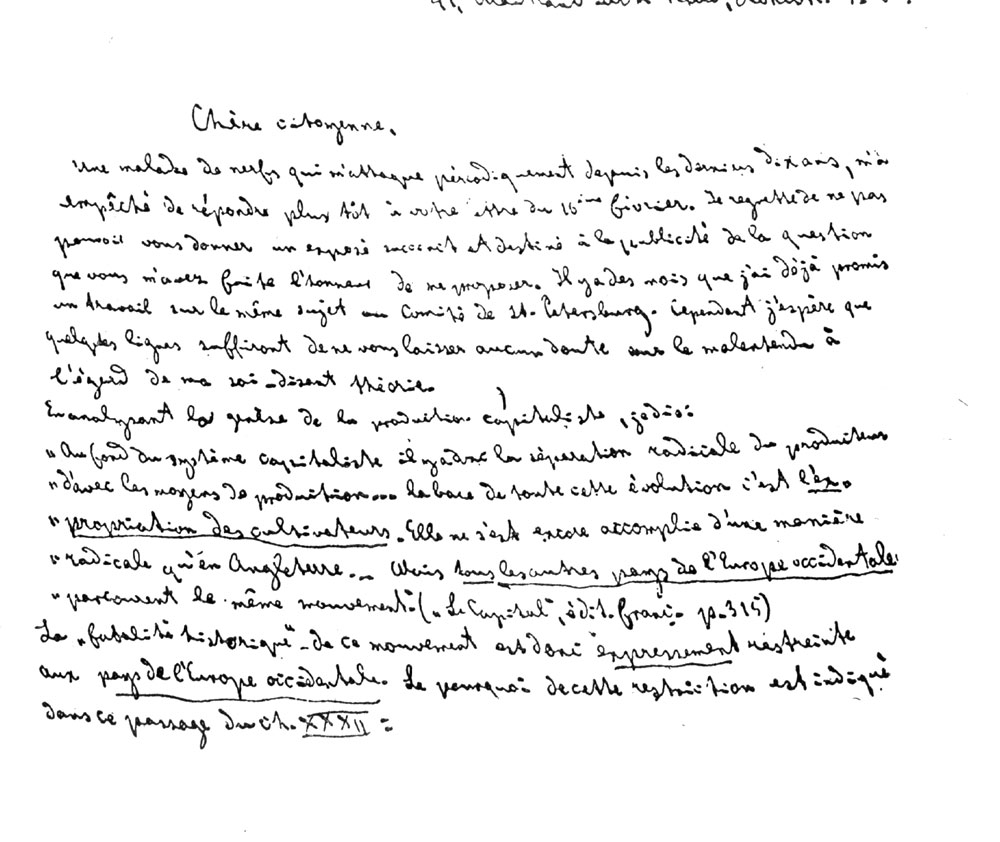 En terminant, Véra Zassoulitch demande à Marx, avec une touchante insistance, d’exposer, sinon d’une manière détaillée, du moins sous forme d’une lettre ‑ qui serait publiée en Russie ‑ ses idées sur la « destinée possible » de la commune rurale et sur « la théorie de la nécessité historique pour tous les pays du monde de passer par toutes les phases de la production capitaliste ».